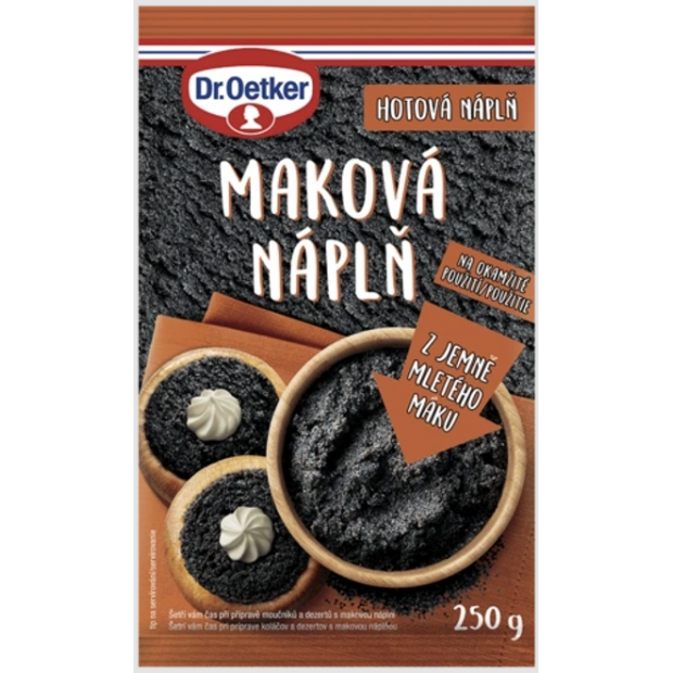 Maková náplň Dr Oetker (Mohn) na dorty, sušenky, knedlíky a sladké dezerty. Hotová náplň z nejlepšího vymačkaného modrého máku. Žádné mletí, vaření ani sypání. Vyzkoušejte staré rodinné recepty s hotovou makovou hmotou Dr.Oetkera. Připraveno k pečení, maková nádivka od Dr. Oetker ušetří časově náročnou přípravu makové hmoty. Vhodné i pro přípravu dezertů.