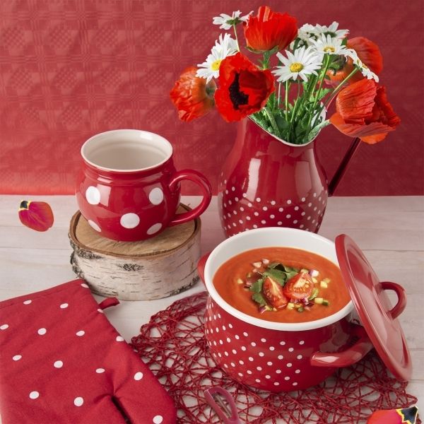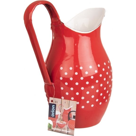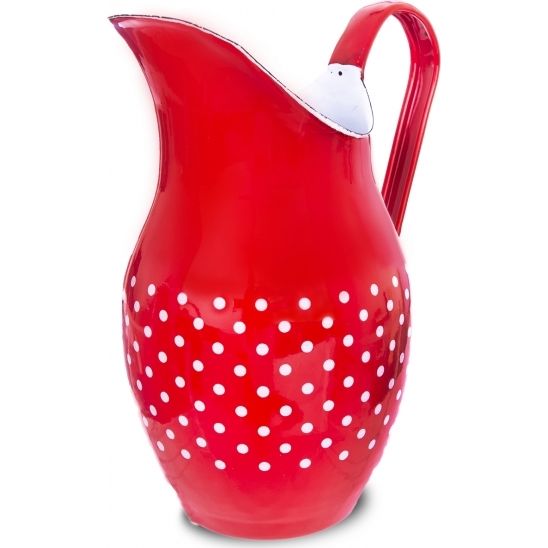 Stylový červený džbán s tečkami, odkazující na roztomilý retro design, je opatřen výlevkou a uchem. Je vyrobený z kvalitního smaltovaného plechu, jenž zaručuje dlouhou dobu používání.