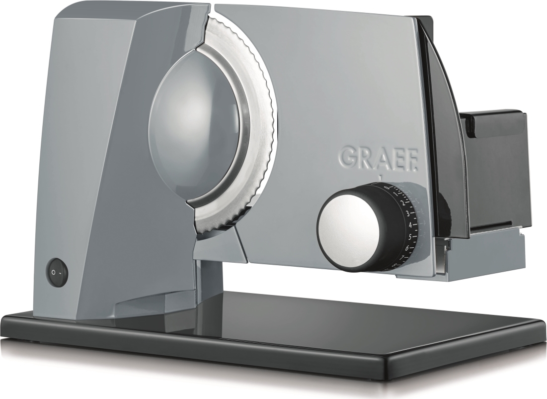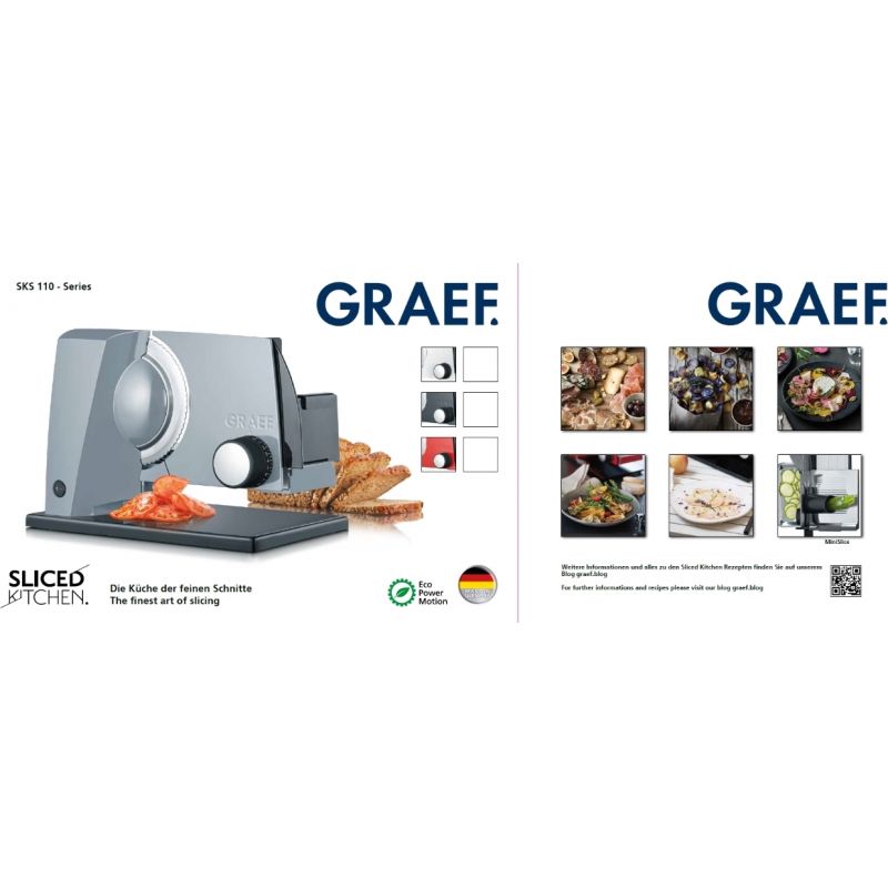 Elektrický kráječ GRAEF SKS 11000 zoubkovaný nerezový řezný kotouč o průměru 170 mm s bezpečnostním odnímatelným krytem zcela nová revoluční konstrukce kompaktní konstrukce, minimální nároky na místo vysoce stabilní provedení s opěrnou deskou plastový