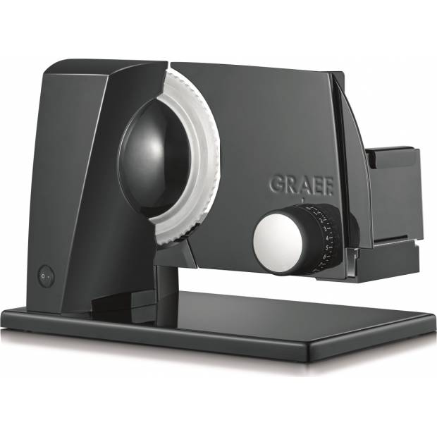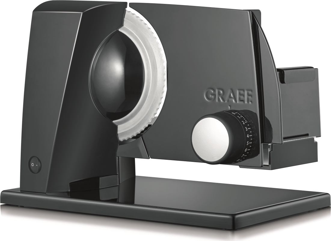 Elektrický kráječ GRAEF SKS 11002 zoubkovaný nerezový řezný kotouč o průměru 170 mm s bezpečnostním odnímatelným krytem zcela nová revoluční konstrukce kompaktní konstrukce, minimální nároky na místo vysoce stabilní provedení s opěrnou deskou plastový