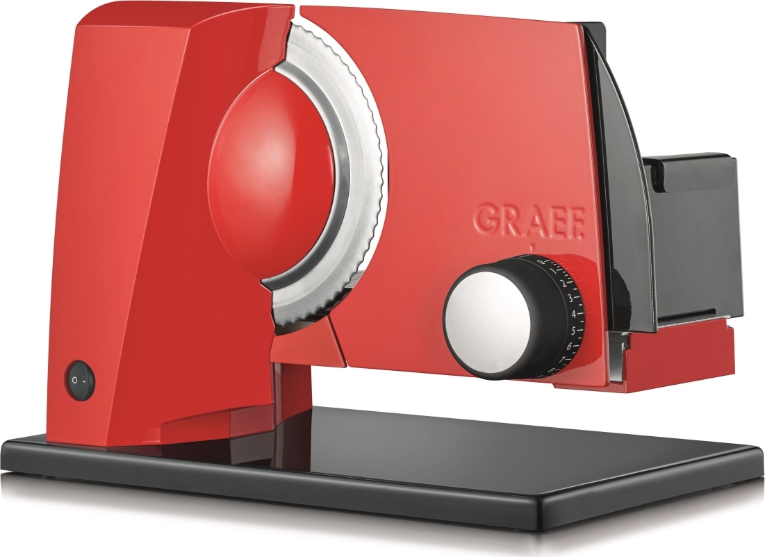 Elektrický kráječ GRAEF SKS 11003 zoubkovaný nerezový řezný kotouč o průměru 170 mm s bezpečnostním odnímatelným krytem zcela nová revoluční konstrukce kompaktní konstrukce, minimální nároky na místo vysoce stabilní provedení s opěrnou deskou plastový