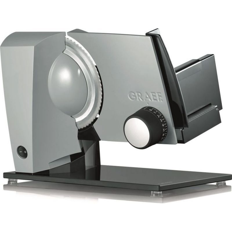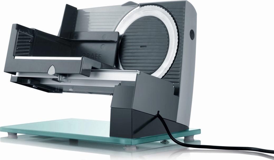 Elektrický kráječ GRAEF SKS 12100 zoubkovaný nerezový řezný kotouč o průměru 170 mm s bezpečnostním odnímatelným krytem zcela nová revoluční konstrukce kompaktní konstrukce, minimální nároky na místo vysoce stabilní provedení se skleněnou černou opěrno