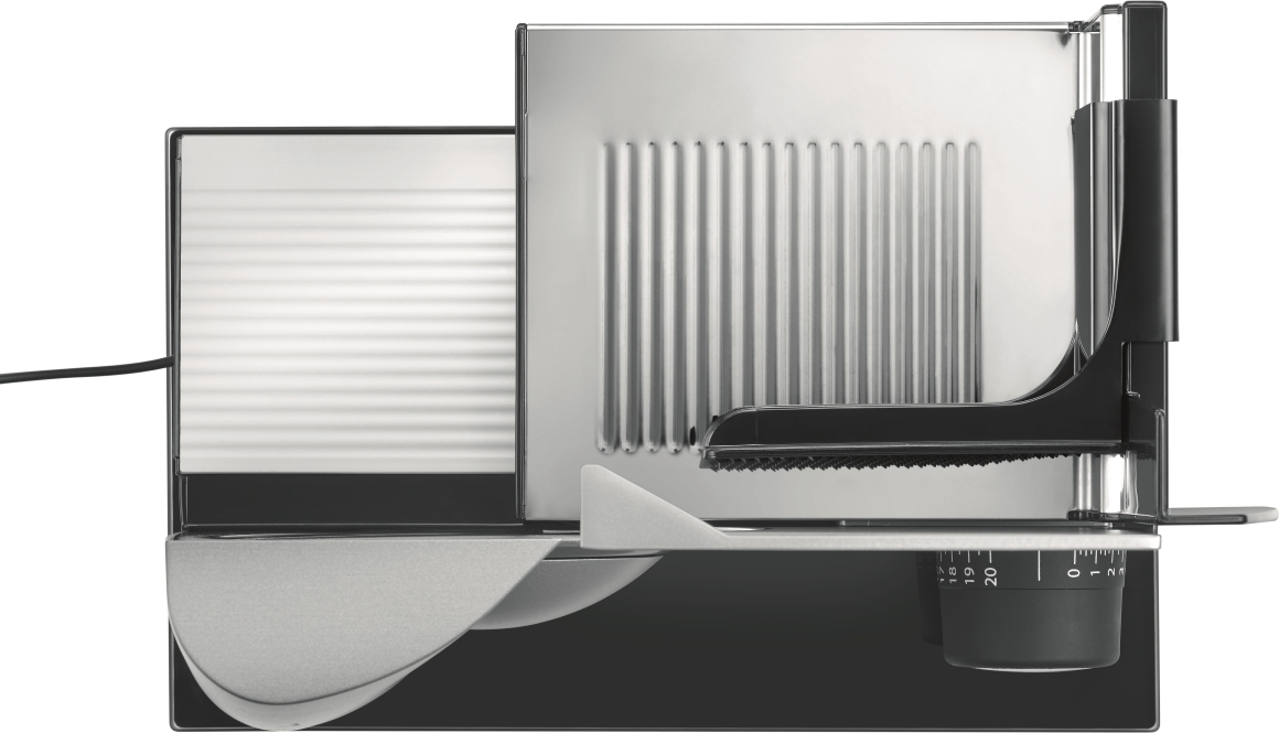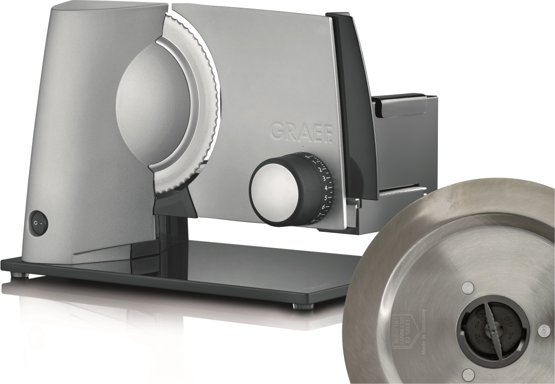 Elektrický kráječ GRAEF SKS 32020 zoubkovaný nerezový řezný kotouč o průměru 170 mm s bezpečnostním odnímatelným krytem zcela nová revoluční konstrukce kompaktní konstrukce, minimální nároky na místo vysoce stabilní provedení se skleněnou černou opěrno