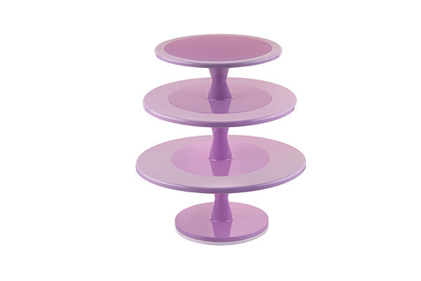 Fialový stojan se skládá ze tří pater (průměry 35 cm, 30 cm a 24 cm). Snadno se sestaví, jednotlivá patra se dají využívat samostatně. Spodní patro (35 cm) navíc může sloužit nejen při servírování ale i při zdobení, protože je otočné. Stojan můžete po rozebrání mýt v myčce. Výška sestaveného stojanu (všechny tři patra) je 37 cm.