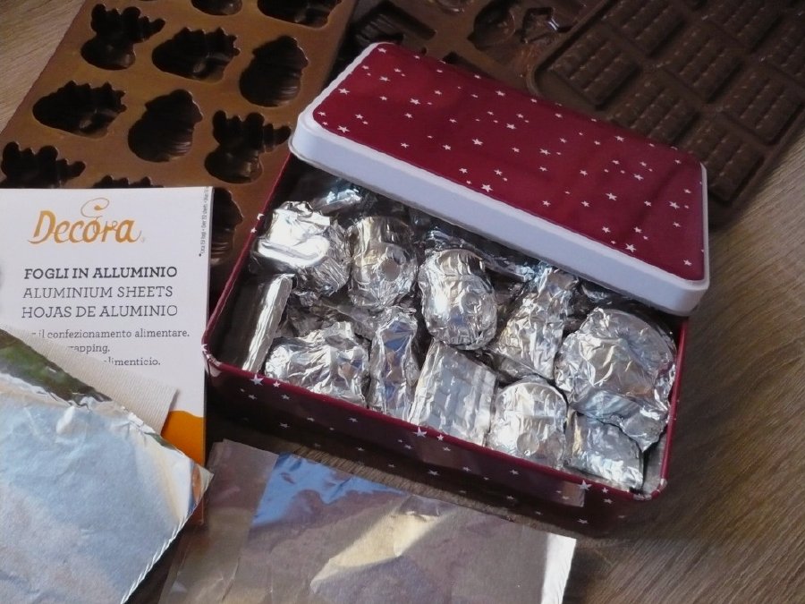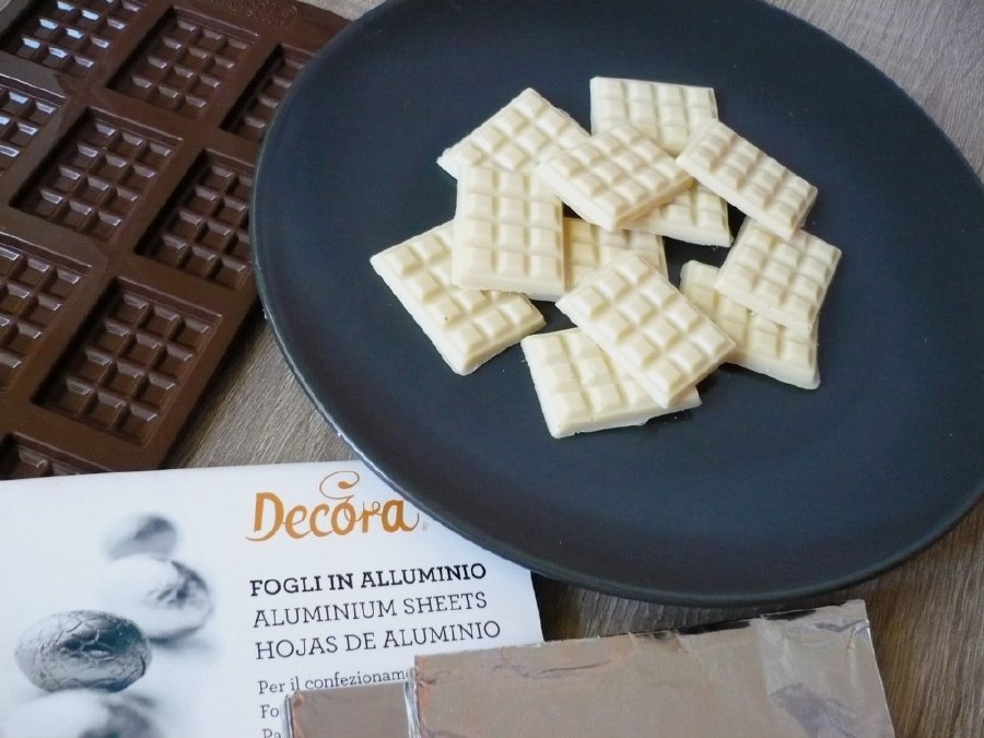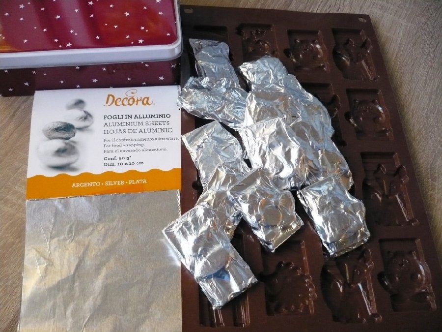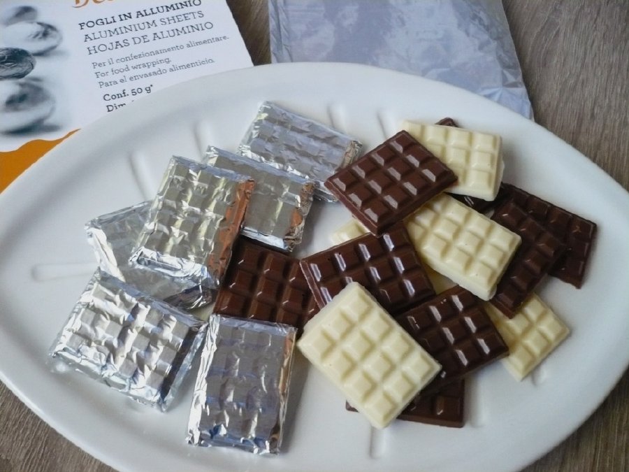Barevné hliníkové folie pro stylové balení čokolád a pralinek. Stříbrná barva, 10 x 10 cm – 50 g, v balení 150 ks. Na výběr i další barvy.