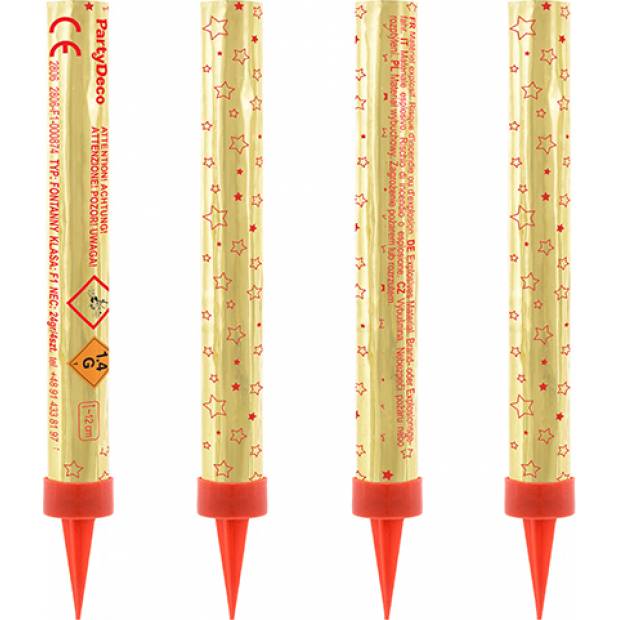 Svou narozeninovou oslavu můžete rozzářit tímto malým fontánovým ohňostrojem na dortu pro všechny oslavence, malé i velké. Pokud vyrábíte vícepatrové dorty, můžete na každou úroveň dortu umístit několik fontán. Bezpečnostní pojistku najdete pod červeným plastovým víčkem. Bezpečnostní třída 1, doba hoření cca 80 sekund. Balení obsahuje 4 ks fontány o délce 12 cm.