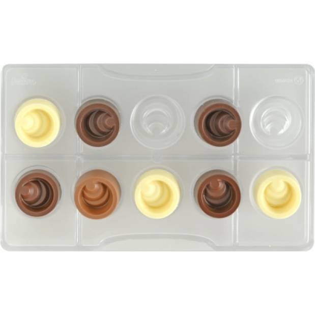 Profesionální forma na čokoládu vyrobená z polykarbonátu, materiál, který umožňuje získat lesklé a perfektní čokolády. Mnoho patentovaných modelů pro výrobu čokolády s původními tvary a novou trojrozměrnou linii s exkluzivními tvary lze kombinovat do dokonalého spoje a získat tak 3D čokolády pro nejrůznější příležitost. Omyvatelná forma je vyrobená ze zdravotně nezávadného materiálu. Forma má 10 otvorů na čokoládky o rozměru 30 x 15 mm.
