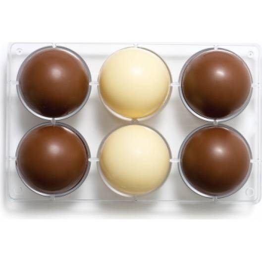 Profesionální forma na čokoládu z italského polykarbonátu Decora. S formou vytvoříte velké čokoládové polokoule. Pokud chcete celou kouli, můžete dát dohromady 2 vytvarované polokoule či koupit dvě formy na čokoládu. Pomocí inteligentního mechanismu na každé formě je k sobě snadno připojíte. Průměr koule je 7,5 cm.