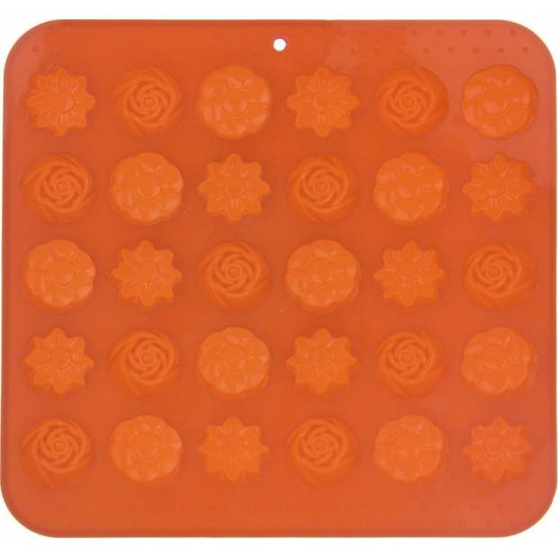 Silikonová forma Vám vytvoří krásné květy z bílé nebo tmavé čokolády. Můžete v ní ale stejně dobře tyto tvary upéci z těsta. Oranžová. Materiál: silikon. 30 květů. Snáší vysoké teploty (od -40 °C do +230 °C), nepřejímá chutě ani vůně z použitých potravin. Rozměry: 21x20,5x1,5 cm, květ pr. cca 2,8 cm. Lze mýt v myčce na nádobí.