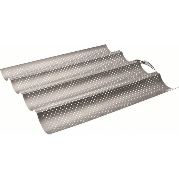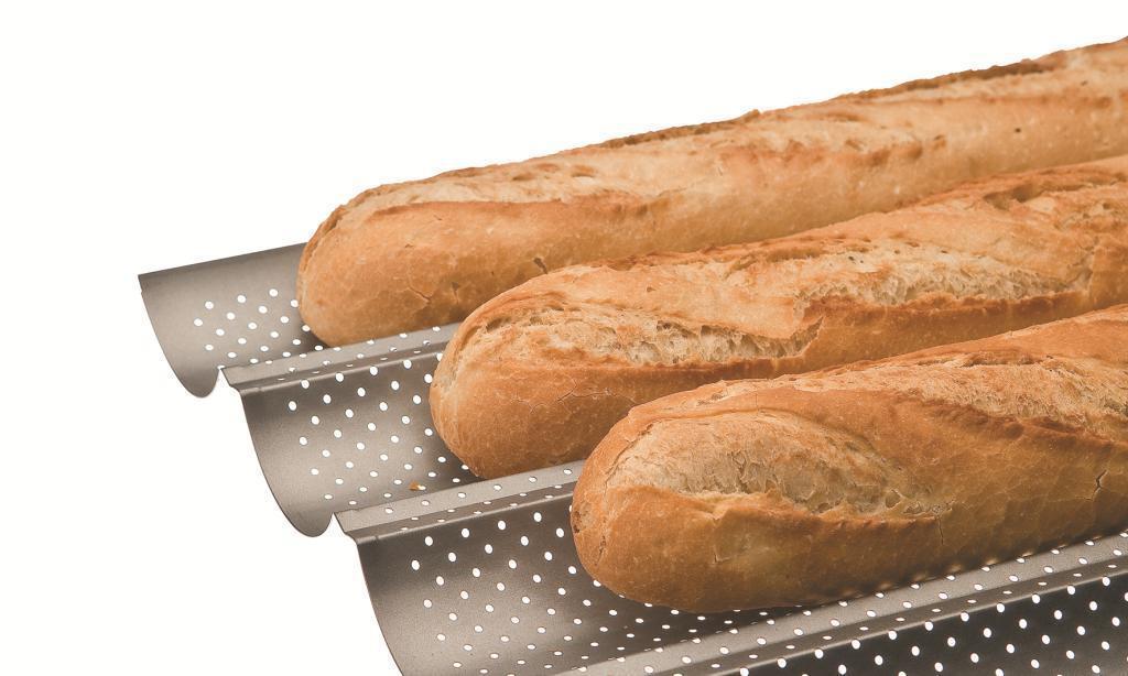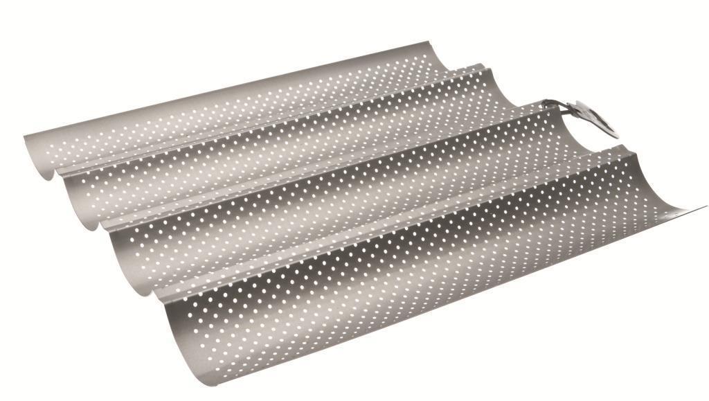 Originální forma na jednoduché upečení 4 baget má rozměr 33 x 38 centimetrů. Kovový základ je potažený nepřilnavou vrstvou a speciální perforování zajišťuje zlatavou a křupavou kůrku. Forma na pečení baget snese bez problémů teploty až do 230° Celsia v horkovzdušné plynové nebo elektrické troubě. Nedoporučujeme mytí v myčce nádobí, ale vzhledem k použitému materiálu je i mytí v ruce velmi snadné. Tento pečící plech na bagety můžeme vřele doporučit.