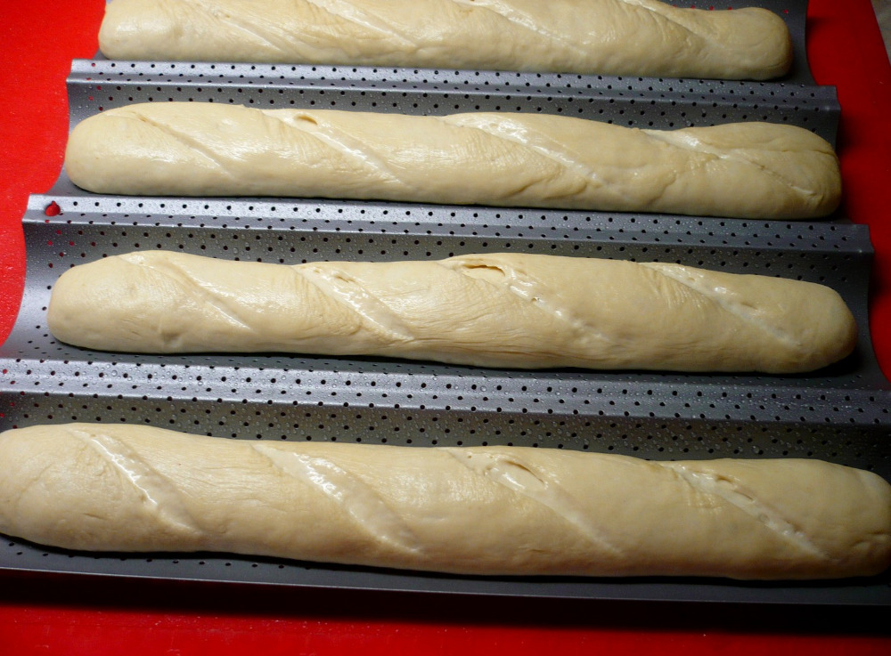 Formu-pečící plech na bagety můžu jen doporučit. Pracuje se mi s ním moc dobře, hlavní výhodou je to, že si bagety udrží svůj tvar a těsto přitom může být i trochu volnější. Povrch je nepřilnavý, není třeba ho ničím potírat. Další nespornou výhodou je to, že plech je perforovaný a bagety jsou po celém povrchu dobře a stejnoměrně upečeny a jsou krásně křupavé. Na plechu peču různé druhy baget, podle toho, k čemu je budu podávat. Ještě jsem se ale nezklamala. Ty bez tuku, jsou určeny ke konzumaci v den pečení a ty, kde se do těsta přidává tuk nebo škvarky, jsou vláčné i na druhý den.