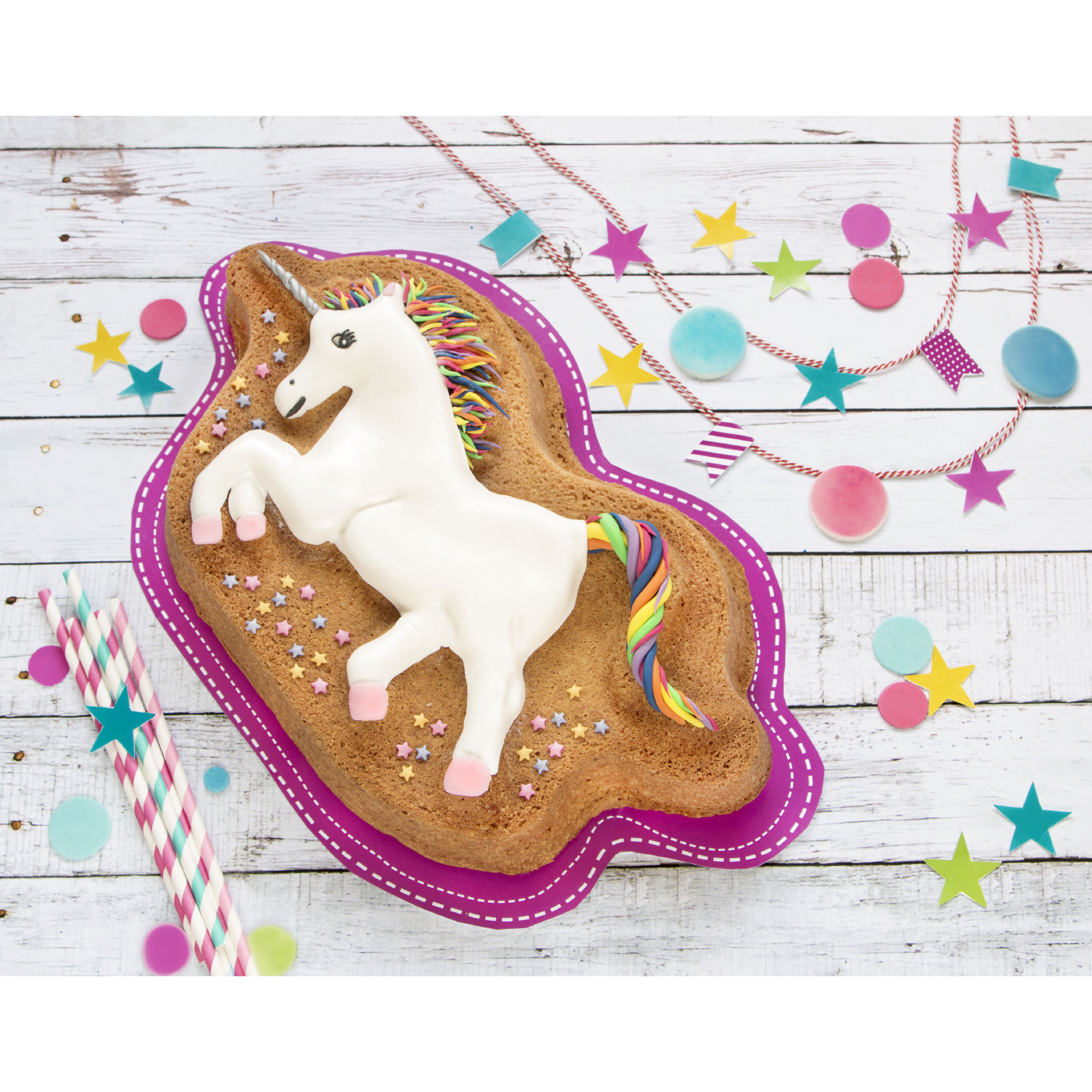 Forma na pečení ve tvaru jednorožce nejen na dětské dorty k narozeninám i jiným příležitostem. Objem 2,5 l, rozměry 36 x 21 cm.