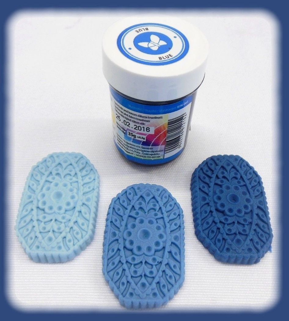 Nádherných modrých odstínů dosáhnete pomocí gelové barvy. Je určena na barvení potahovacích i modelovacích hmot. V balení 35 g.