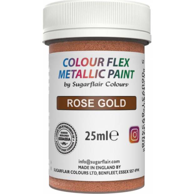 Metalická jedlá barva Sugarflair umožňuje snadnou přeměnu dortů a výtvorů díky husté konzistenci, příjemnému třpytu a univerzálním aplikacím. Promění obyčejné dorty v zářivé, lesklé kreace s oslnivým kovovým povrchem. Hustá konzistence zajišťuje velkorysou aplikaci, zanechává konzistentní krytí a luxusní finiš. S menším počtem tahů štětcem lze vytvářet velké oblasti, malé oblasti, složité vzory a odvážné a krásné zprávy od ruky nebo šablony Tento univerzální produkt je připraven k použití na cukrové pasty, květinové a modelovací pasty, marcipán, tvrdou čokoládu, tuhovou královskou polevu nebo máslový krém k vytvoření nekonečných dekorů a krásných dortů a pamlsků pro zvláštní příležitosti. Tato barva se snadno aplikuje přímo na cukrovou pastu, květinovou pastu, modelovací pastu, Royal Icing nebo jakýkoli jiný hladký, suchý povrch, jako je čokoláda nebo máslový krém, jakmile zatuhnete buď pomocí houby nebo štětce, nebo pro ještě přesnější návrhy lze snadno použít šablony.