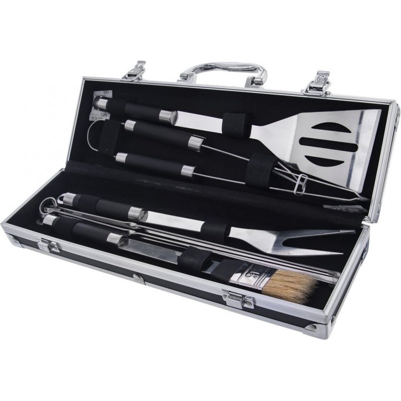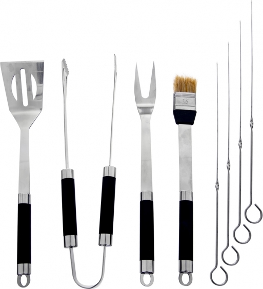Celá sada je vyrobená z kvalitní nerezové oceli a obsahuje obracečku a vidličku, obě o délce 34,5 cm, dále mašlovačku o délce 32 cm, kleště o délce 34 cm a čtyři jehly na špíz o délce 25 cm. Kromě jehel na špíz je náčiní opatřeno praktickou rukojetí pro jeho pohodlnější držení.