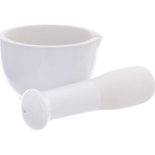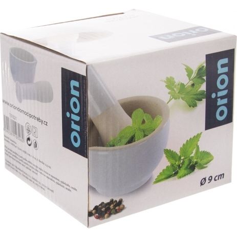 Hmoždíř s výlevkou na drcení koření, bylinek, přípravu pesta. Materiál: kamenina. Vnitřní část hmoždíře a silnější strana tloučku je neglazovaná - pro lepší účinek drcení. Rozměry: vnitřní pr. 7,5 cm, vnější 9 cm, v. 6 cm, délka tloučku 12,5 cm.