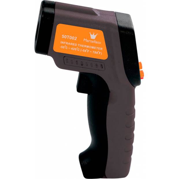 Digitální infračervený teploměr s LCD displejem. Provozní rozsah od -50 °C do +420 °C. Jednoduchý design pistole znamená, že uživatel může jednoduše „namířit a vystřelit“ a odečíst povrchovou teplotu a poměr vzdálenosti k bodu 12:1 znamená, že přesné měření lze provést v rozumné vzdálenosti od objektu jehož teplotu chcete změřit. Integrované laserové ukazovátko ukazuje přesný bod měření na cílovém povrchu.