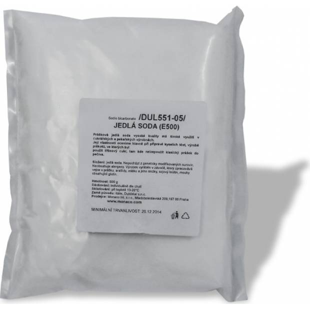 Prášková jedlá soda se využívá v cukrářských a pekařských výrobnách. Díky svým vlastnostem se používá především při přípravě kyselých druhů těst, dětských piškotů, ve kterých je třtinový cukr a všude tam, kde není možné použít klasický kypřící prášek do pečiva. Soda má mimo jiné blahodárné účinky na zažívání. Balení obsahuje 1kg/ sáček. Dávkování je zcela individuální, dle potřeby.