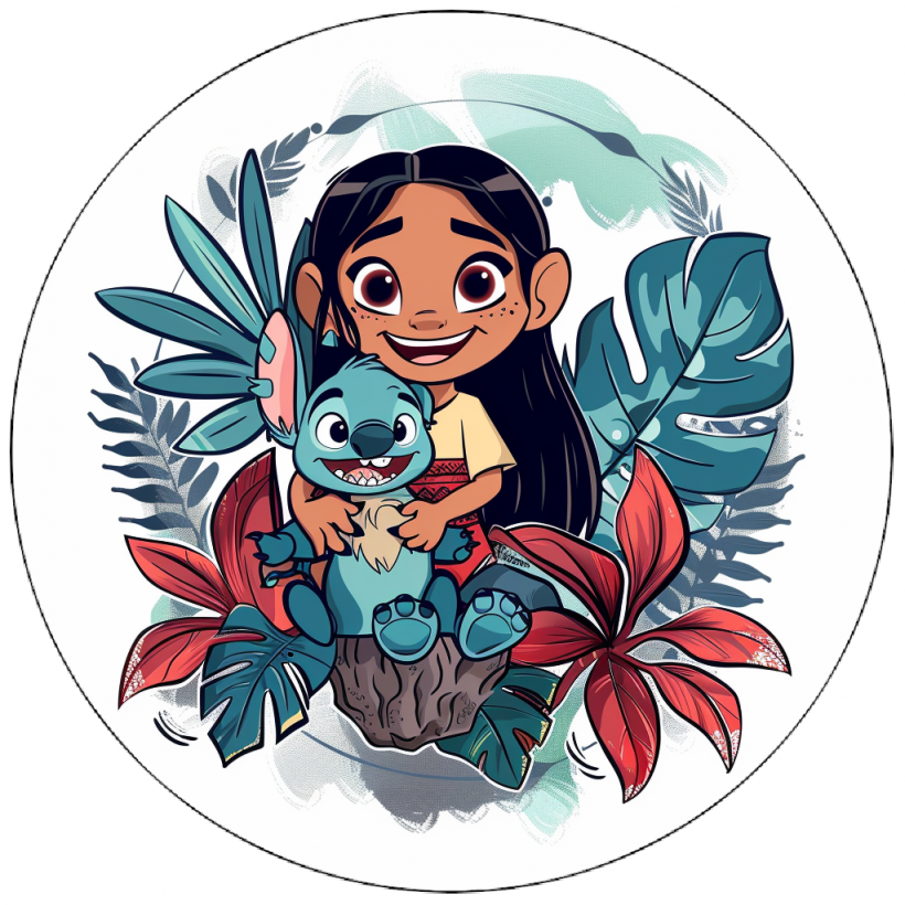 Roztomilý Stitch obklopený květinami vnese do oslavy hravost a tropickou atmosféru.