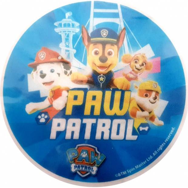 Jedlý papír s motivem Tlapková patrola od Modecor. Průměr 14,5 cm.