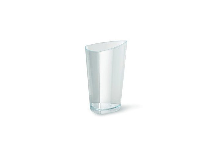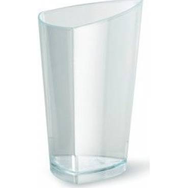 Hranatý pohár má zkosené strany a díky výrobnímu materiálu (PS), který připomíná plexisklo a má zelenkavý nádech se v něm zajímavě odráží světlo a vytváří se duhové odlesky. Pohár vydrží teploty max. 40°C. Neservírujte v něm horké pokrmy. Rozměry: 7,2 x 7,2 x 7,9 cm.