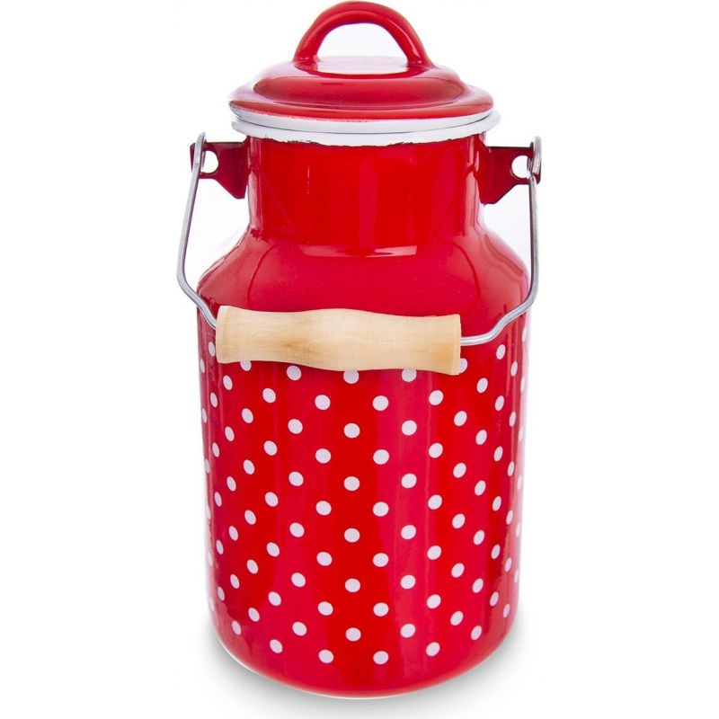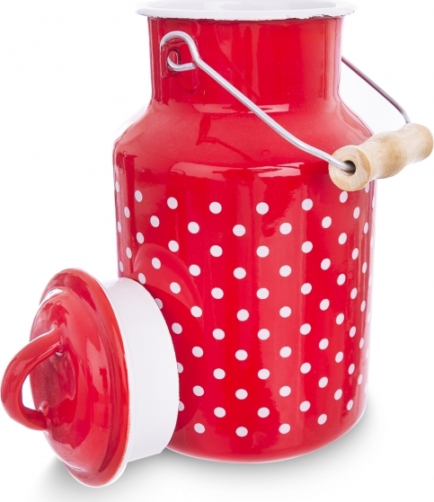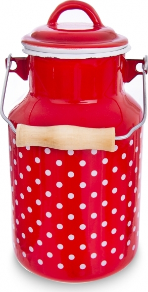 Červená barva a bílé puntíky. Dekor, kterým se pyšní tato krásná smaltovaná konvice o objemu 2 l na čerstvé mléko, nás snad nikdy neomrzí. Hodí se do moderní kuchyně i na venkovskou chalupu. Konvice je navíc nesmírně praktická. Ladicí červená poklička a dřevěná úchytka zaručí její pohodlné přenášení bez zbytečných ztrát.
