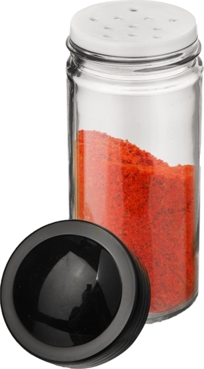 Designový otočný dřevěný stojan na trojúhelníkové základně rozměru 18x18x18 cm s černými nerezovými lištami s otvory, jehož součástí je 12 kusů skleněných kořenek průměru 4,5 cm a výšky 10 cm. Každá má plastové sypátko a černé víčko. Podle vloženého koření nebo dochucovadla tak můžete sypátko ponechat nebo jej odděláte a pohodlně nasypete a vysypete větší kousky, např. nové koření, hřebíček.
