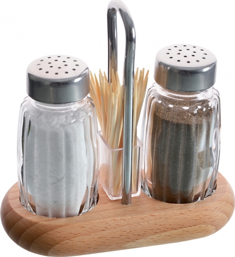 Dochucovací souprava - solnička a pepřenka ve stojánku se zásobníkem na párátka