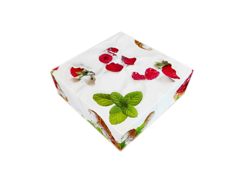 "Krabice s barevným potiskem, vyrobená z velmi kvalitního tvrdého papíru na přenášení dortů, rolád, zákusků, cukroví…