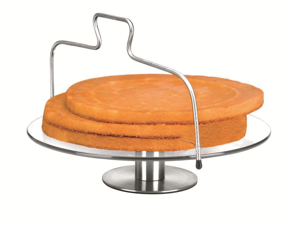 Kráječ, se kterým rovnoměrně prokrojíte dortový kropus. Můžete na něm nastavit požadovanou tloušťku plátu (od 1,5 cm do 6 cm) posunutím struny. Strunu pak protáhnete korpusem a máte ho prokrojený. Kráječ můžete mýt v myčce. Délka struny je 33 cm.
