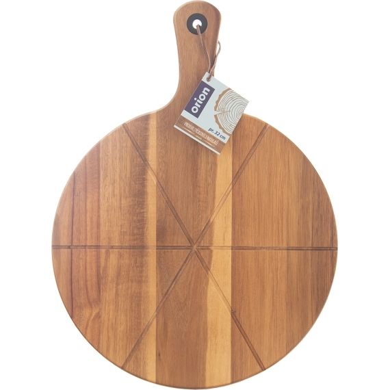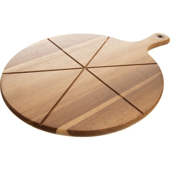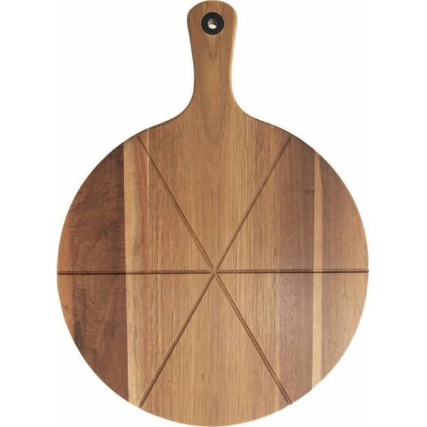 Servírovací prkénko na pizzu s rukojetí a drážkami pro krájení na šestiny. Možnost zavěšení. Materiál: akáciové dřevo. Rozměry: pr. 32 cm, d. 43,5 cm, v. 1,5 cm.