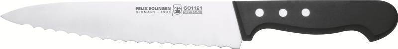 Vzhledově jednoduše vypadající kuchyňský nůž s délkou čepele 21cm, který je opatřen plastovou rukojetí. Její pevnost je zajištěna prostřednictvím tří nýtů. Ideální tvar je snadno uchopitelný do ruky a nabízí veliký komfort při krájení. Nerezová ocel je vhodná pro ruční broušení. Výrobek lze vkládat do myčky na nádobí.