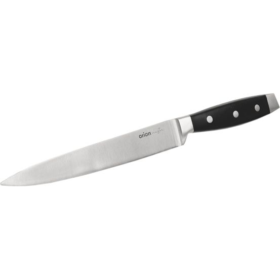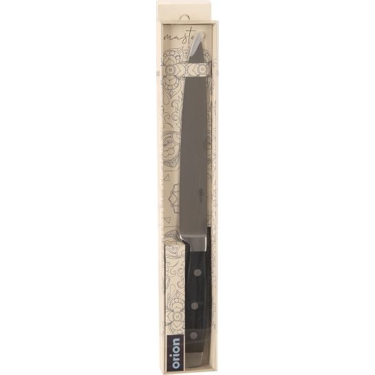 Kuchyňský nůž z kolekce Master pro profesionální využití. Bude se hodit i pro vášnivé amatérské kuchaře, domácí gurmány a labužníky. Robustní čepel je opatřena štíhlým ostřím. Krájení je snadné, přesné, dokonalé. Ostrost v celé délce čepele vydrží při správném zacházení velmi dlouho. Nýtované rukojeti z vysoce kvalitního plastu mají zaoblené hrany a skvěle padnou do ruky. Dokonalé slícování jednotlivých částí brání zachycování usazenin a bakterií. Materiál: nerezová ocel 430 (tvrdost 56 HRC – podle Rockwella), rukojeť - plast ABS se třemi nerezovými nýty. Rozměry: celková délka nože 34,5 cm, čepel 20 cm, ostří 20 cm. Po umytí v myčce dobře vysušte. Častým používáním myčky dochází k postupnému tupení ostří – doporučujeme ruční mytí, které je vůči nožům šetrnější i rychlejší. Nůž máte ihned opět k dispozici a nemusíte čekat na celý mycí cyklus myčky. Široký výběr tvarů nožů z kolekce Master.