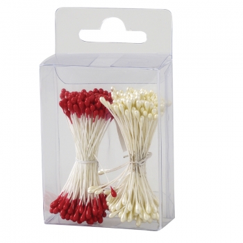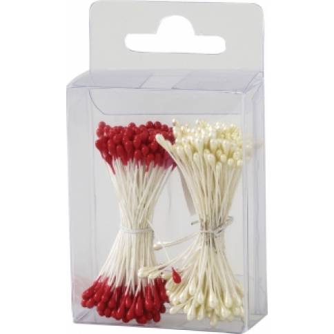 Lesklé pestíky v odstínu bílé a červené pro středy u tzv. jedlých květin vyrobené z cukrové hmoty. Pestíky jsou nejedlé, slouží ale k realistyckému vzhledu cukrové květiny.