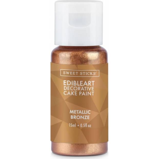 Metalická jedlá umělecká barva Sweet Sticks je perfektní způsob, jak přidat trochu třpytu do vašich lahodných výtvorů. Barva je připravena k použití přímo z lahvičky, takže ji není třeba míchat s žádnými dalšími přísadami. Po nanesení a zaschnutí je pigment uzavřen v povrchu – žádný prach nebo šmouhy. Je vhodná na marshmallows, fondant, ganache, modelovací čokoládu, atd.