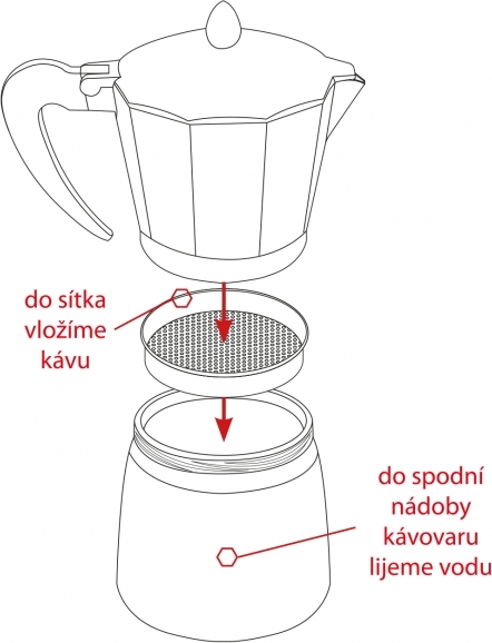 Do spodní části kávovaru, která má objem 200 ml, nalijete teplou vodou a vložíte zásobník naplněný namletou kávu. Nakonec sešroubujete vrchní a spodní část kávovaru dohromady. Kávovar můžete použít na elektrických, sklokeramických i plynových sporácích. Po několika minutách varu vzniká tlak, díky kterému se espresso dostane do horní části nádobky.