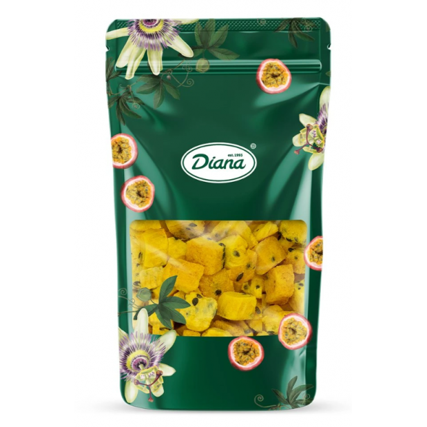 Lyofilizovaná mučenka (marakuja) od značky Diana, balení 35 g. Výživová pochoutka bez přidaného cukru, lepku, laktózy a palmového oleje. Vhodná pro vegetariány i vegany.