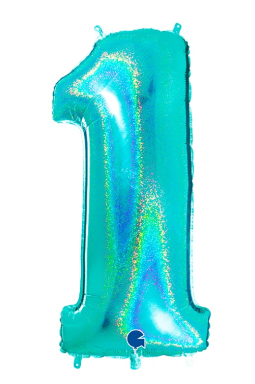 Nafukovací balónek číslo 1 tyrkys holografický 102 cm - Grabo