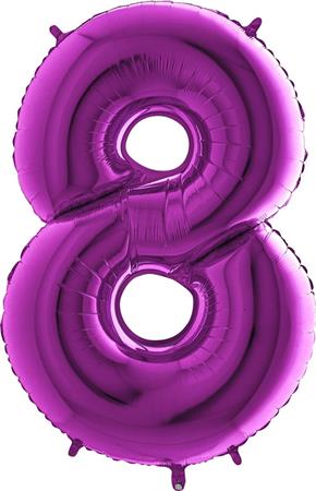 Fialový balónek číslo 8. Balónek je vyrobený z pevné fólie. Po nafouknutí vzduchem vydrží naplněný i několik týdnů, pokud si balónek necháte naplnit héliem vydrží pevně nafouklý a bude létat až 4 dny. K nafouknutí balónku používejte vždy speciální pumpičky k tomuto určené, pokud použijete kompresor s velkým tlakem, může balónek prasknout. Nevhodné pro děti do 3 let. Hélium nevdechujte.