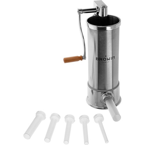 Praktická sada (6 kusů) náhradních trychtýřů věnovaná modelu vertikálního pěchovadla Browin - s kapacitou 5 kg. Každý trychtýř má ve výstupní části jiný průměr: 14 mm, 18 mm, 21 mm, 25 mm, 29 mm a 35 mm. Průměry objímky ve vstupní části jsou zase: 16 mm, 20 mm, 23 mm, 27 mm, 31 mm a 37 mm. Průměr límce se západkami (při napojení na tělo plničky) je pro všechny nálevky v sadě stejný a je 42 mm. Nálevky jsou vyrobeny z vysoce kvalitního plastu, který zajišťuje jejich správnou účinnost a odolnost. Umožňují provádět proces plnění pohodlným, účinným a hygienickým způsobem. Díky možnosti výměny nálevek používaných při intenzivním používání plniček se prodlužuje životnost zařízení, což je velmi důležité pro každého výrobce domácích uzenin. Výměna nálevky je snadná, stejně jako její udržování v čistotě.