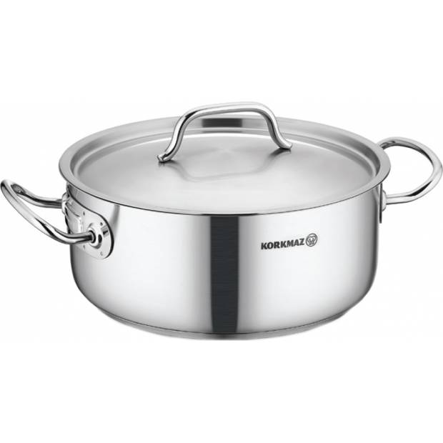 Značka Korkmaz vyniká kvalitním nádobím, které si nyní můžete pořídit i u nás. Tento nízký kastrol je vyroben z ušlechtilé oceli 18/10. Má super základnu pro rovnoměrné a rychlé rozvádění tepla po celém dnu hrnce. Vnější povrchy jsou velmi pečlivě opatřeny matným povrchem. Ergnomické rukojeti usnadní držení i přenášení hrnce. Před prvním použitím kastrol umyjte vodou s trochou saponátu na nádobí. Při jeho čištění nepoužívejte drátěnky a kartáče z tvrdého kovu. Hrnec je vhodný i pro mytí v myčce. Je plně kompatibilní s indukční varnou deskou. Série nádobí Proline je postavena na základním systému Solar Base, který zajišťuje nejvyšší přenos tepla na všech typech sporáků, čímž šetří čas a energii. Rozměry 20 x 9 cm, objem 2,8 l.