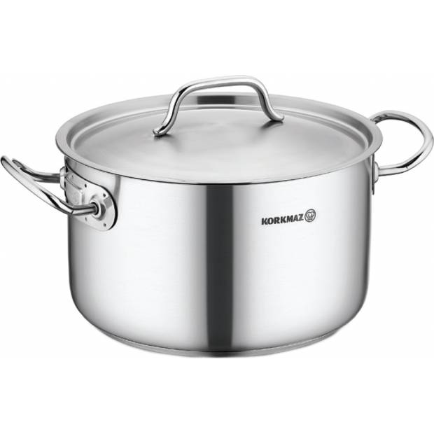 Značka Korkmaz vyniká kvalitním nádobím, které si nyní můžete pořídit i u nás. Tento nerezový kastrol je vyroben z ušlechtilé oceli 18/10. Má super základnu pro rovnoměrné a rychlé rozvádění tepla po celém dnu hrnce. Vnější povrchy jsou velmi pečlivě opatřeny matným povrchem. Ergnomické rukojeti usnadní držení i přenášení hrnce. Před prvním použitím kastrol umyjte vodou s trochou saponátu na nádobí. Při jeho čištění nepoužívejte drátěnky a kartáče z tvrdého kovu. Hrnec je vhodný i pro mytí v myčce. Je plně kompatibilní s indukční varnou deskou. Série nádobí Proline je postavena na základním systému Solar Base, který zajišťuje nejvyšší přenos tepla na všech typech sporáků, čímž šetří čas a energii. Rozměry 24 x 14 cm, objem 6,2 l.