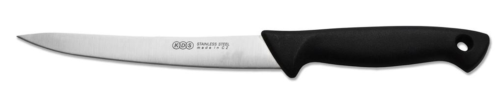 Kvalitní kuchyňský nůž české výroby je určen na filetování ryb a masa a najde ve vaší kuchyni široké uplatnění. Materiál: čepel je vyrobena z kvalitní nerezavějící oceli, na rukojeť je použita zdravotně nezávadná plastická hmota - tepelná odolnost do 100 °C. Je odolný proti nárazu. Lze jej dát do myčky na nádobí. Rozměry: čepel - 14 cm.