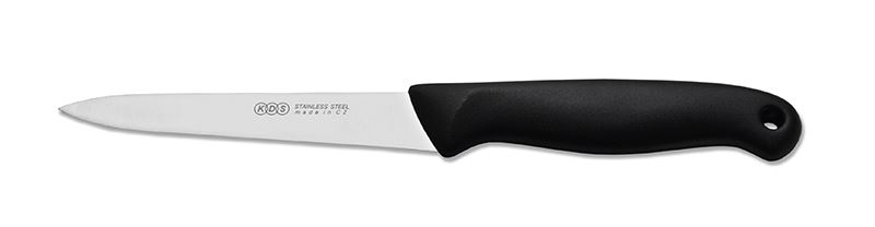 Velmi univerzální kuchyňský nůž, který si hravě poradí s masem i zeleninou. Čepel je dlouhá 12,5 cm, vyrobená z velmi odolné nerezové oceli. Plastová rukojeť usnadní manipulaci s nožem. Je možné jej mýt v myčce nádobí.