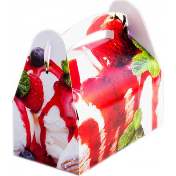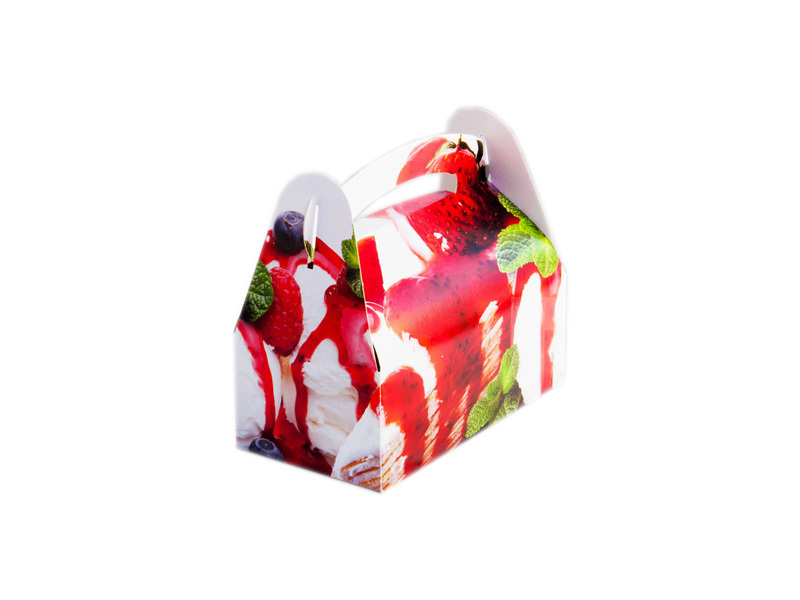 "Taštička z barevného potištěného papíru s barevným potiskem pro bezpečné přenášení různých druhů zákusků, cukroví, koláčů a dalšího pečiva.