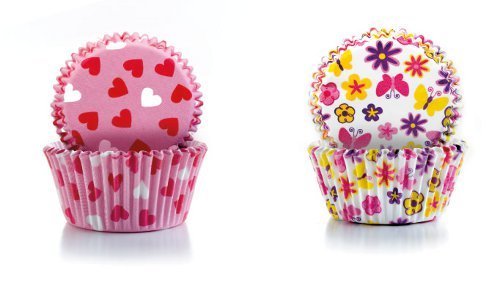 Cukrářské košíčky z papíru, který nepropouští mastnotu, použitelné i na pečení muffin. Dva barevné dekory – kytičky a srdíčka, každý po 50 kusech.