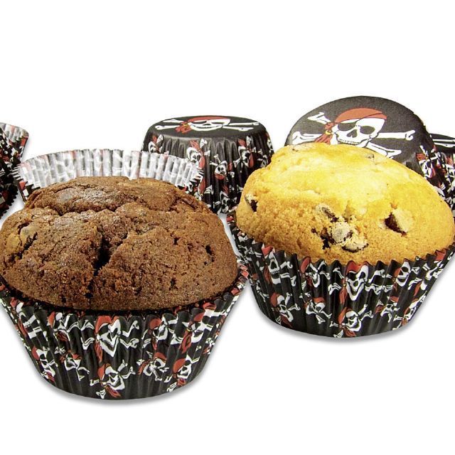 "Papírové pečicí mini formičky - košíčky, vzor piráti. Papírové formičky jsou vhodné na pečení muffinů a cupcakes. Košíčky vždy naplňte těstem jen do 2/3, při pečení těsto zvětší svůj objem.