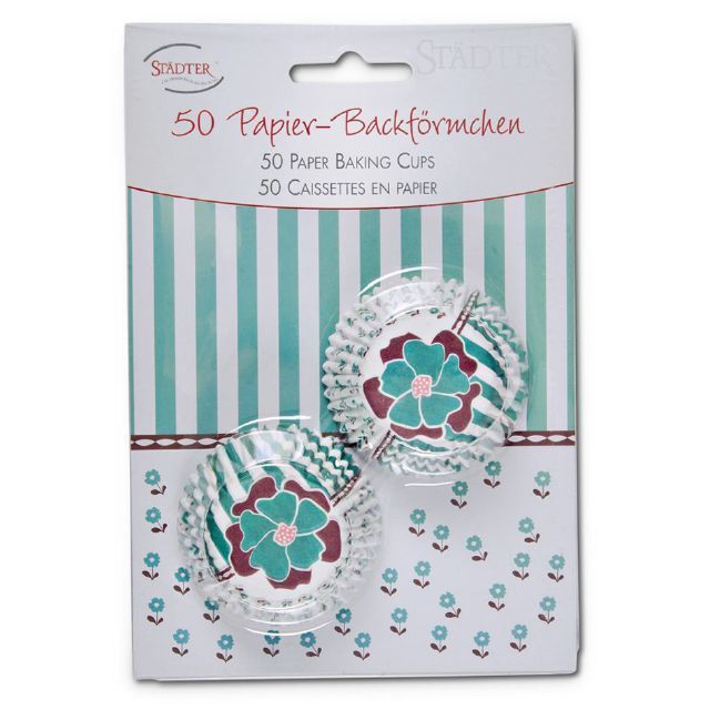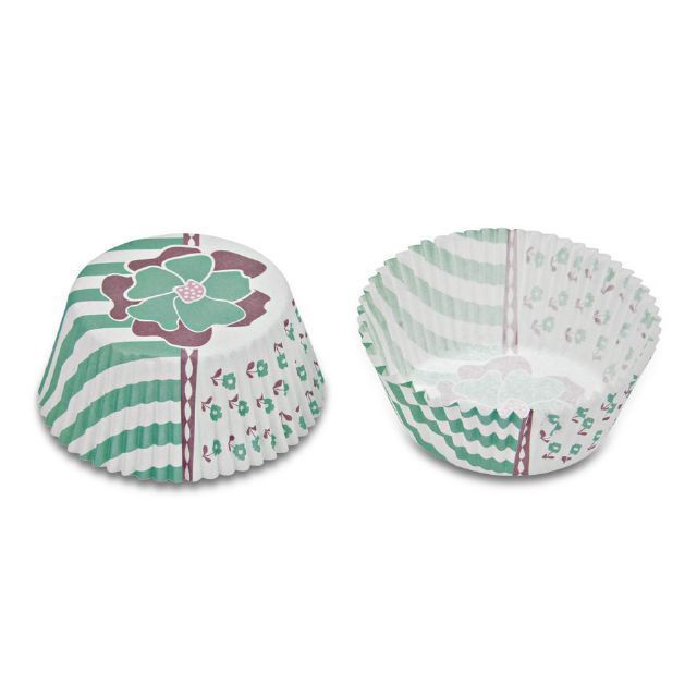 "Papírové mini pečicí formičky - košíčky s tyrkysovými květy a pruhy. Papírové formičky jsou vhodné na pečení muffinů a cupcakes. Košíčky vždy naplňte těstem jen do 2/3, při pečení těsto zvětší svůj objem.