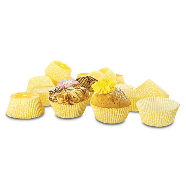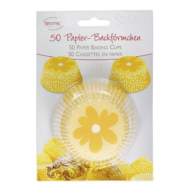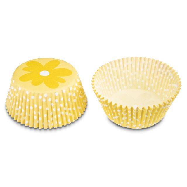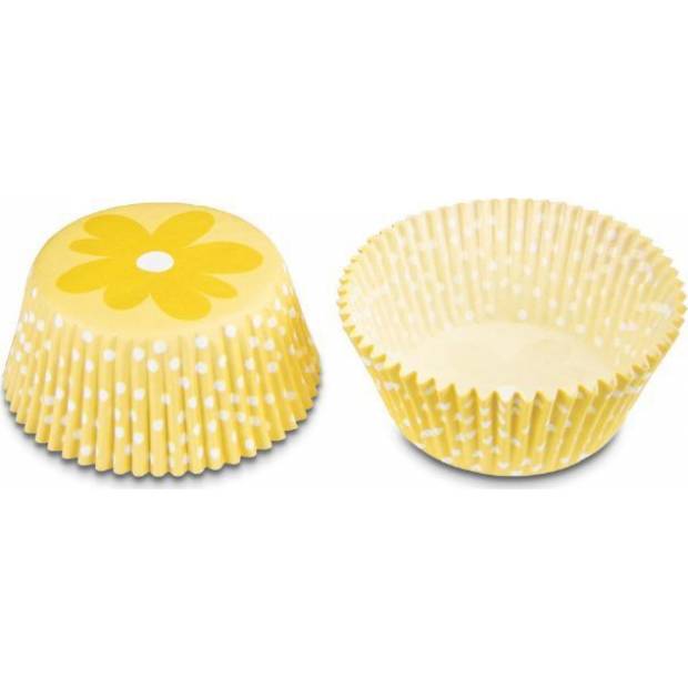 "Papírové pečicí formičky - košíčky, vzor žlutá květina. Papírové formičky jsou vhodné na pečení muffinů a cupcakes. Košíčky vždy naplňte těstem jen do 2/3, při pečení těsto zvětší svůj objem.