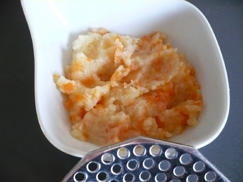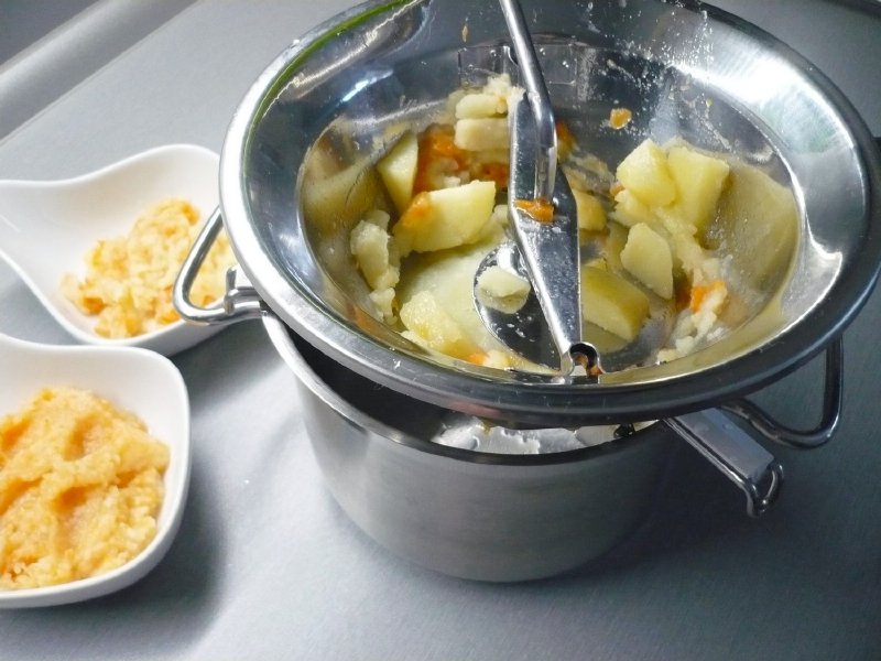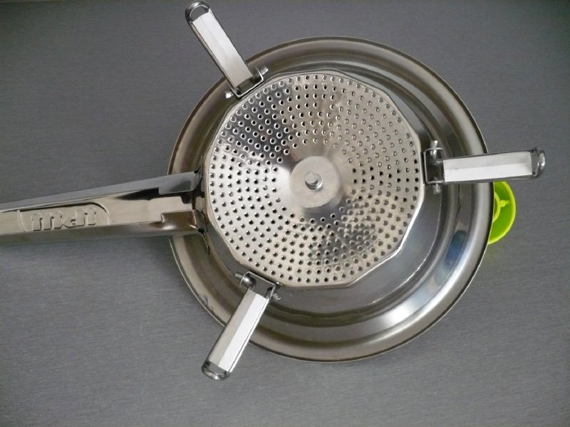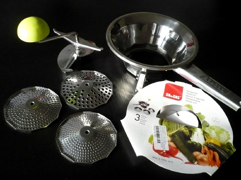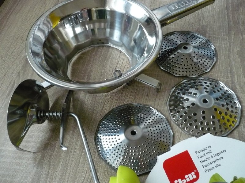 Tento pasírovač mě velice mile překvapil. Je nerezový a velikou výhodou je to, že sada obsahuje i tři výměnné kotouče - disky o různém průměru otvorů. Samotný disk má průměr 10,5 cm. Každý si může zvolit disk s otvory podle své potřeby. Pasírovač se hodí jak pro přípravu běžné stravy, tak pro stravování menších dětí a seniorů ve vyšším věku, kdy se strava musí více rozmělnit. Složení pasírovače je velice snadné. Vybereme si disk s otvory, které zrovna potřebujeme a zamáčkneme ho vypouklou a drsnou stranou nahoru do otvoru na dně. Disk zamáčkneme opravdu důkladně. Pak nasadíme kličku, zamáčkneme směrem dolů ramena, upevníme na jedné straně a pak na druhé. Pasírovač položíme na vhodnou nádobu, díky spodním úchytům dobře drží a nesjíždí. Je vhodný na kulaté nádoby do průměru 20 cm. Pak vložíme danou ingredienci a kličkou točíme ve směru hodinových ručiček. Pokud pasírovaná hmota ke konci ulpívá na stěnách, tak ji shrneme stěrkou pod lopatku.